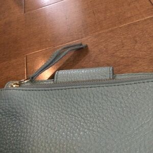 Lots of compartments and very portable. Back coin pocket with a zipper. Leather and in great condition!