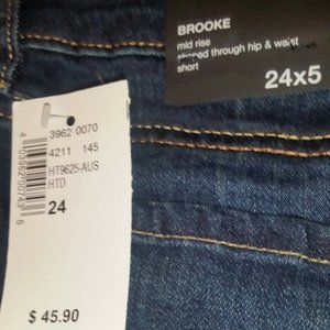 Blue jean shorts. Dark denim . Front zipper, pockets at back. Waist size 24. Never worn. Tags attached. NWT