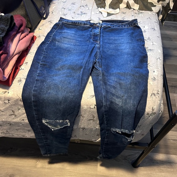 Dark blue jeans with rips in knees