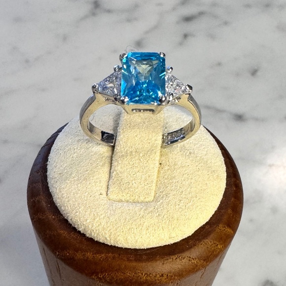 This gorgeous pale blue radiant cut (rectangle) cubic zirconia is flanked by 2 trilliant cut clear cubic zirconia set in silver marked 925 RSC.