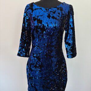 This beautiful dress sits above the knee and is a stunner. Has a bit of stretch and hugs in all the right places without showing everything.