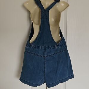 Stylish blue denim overalls with a front pocket and drawstring waist. Perfect for casual outings.