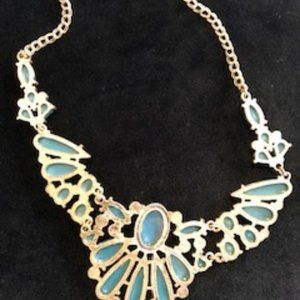 Gorgeous statement necklace! Gold chain with mix of light green and teal and beige stones as well as clear crystals. Necklace is 16” long and can be adjusted up to 19”. (This is a costume jewelry item, not real gold/gems.) Unfortunately the pictures don't do it justice.