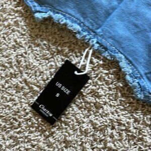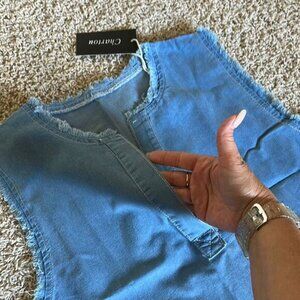 This blue sheath dress is crafted from medium-wash denim, featuring a sleeveless design and a classic crew neckline. Its fitted silhouette offers a flattering look, perfect for casual and work settings. The dress is versatile and stylish, ideal for various occasions.