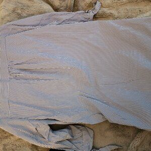 Gorgeous blue/white Pin Stripe button down tunic top with 3/4 length sleeve with tie bow detail at cuff. Excellent fit, falls to mid thigh in back, and upper mid thigh in front. Polyester material, washes beautifully. Can be dressed up or down. Excellent condition