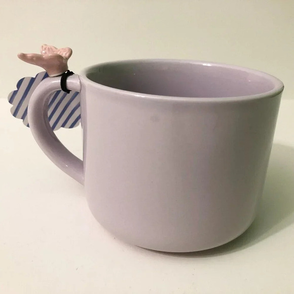 This mug was never used, it still has the tag attached. But the tag is creased. And there are some marks on the bottom of it from storage. Please see all photos for exact mug.