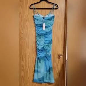 Elegant dress with ruched detailing. Features a beautiful blue/green gradient design. Mesh layer on top of slip.