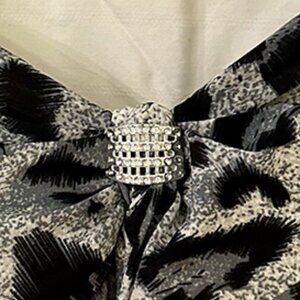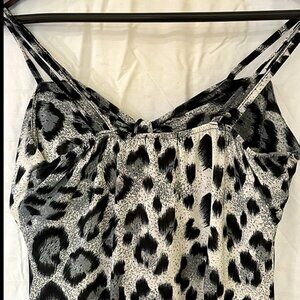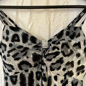 This dress is a bold and eye-catching piece featuring a leopard print pattern in shades of black, gray, blue and white. It has a sleeveless design with thin straps and a slightly flared hemline for a feminine and flowy silhouette. The V-neckline is accented with a small, sparkling embellishment at the center, adding a touch of glamour. This dress would be ideal for a night out, cocktail party, or any occasion where a statement look is desired.