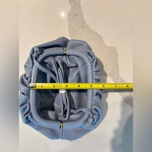 Blue/grey leather pouch bag. Can be worn with or without the strap (strap just tucks inside neatly, isn’t removable). Never worn, great condition.