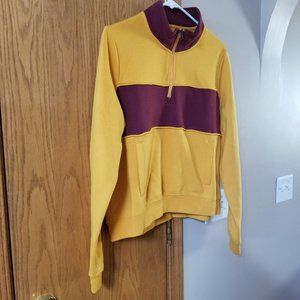 Interior still soft. Kangaroo pocket. Colors burgundy and mustard yellow