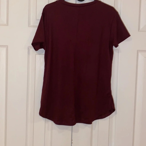 Comfy Bluenotes Burgundy soft knit VNeck top Sz S approx measurements and tiny tear flaw on back photographed same day shipping from smoke free home