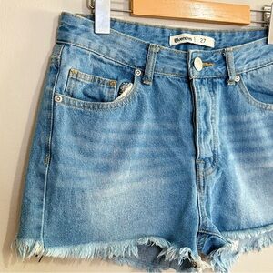 These Bluenotes jean shorts in a vibrant blue hue feature a trendy distressed cut-off hem, offering a casual and relaxed vibe. Crafted from quality denim, they showcase a light to medium wash with natural fading for a vintage-inspired look. Perfect for laid-back outings, these shorts combine style and comfort effortlessly.