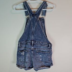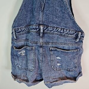 These stylish distressed denim overall shorts are crafted in a classic blue. They offer a comfortable fit and trendy look.