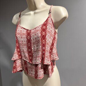 Sleeveless tank top with red and white geometric print and layered ruffle front. Adjustable spaghetti straps. Lightweight and soft fabric.