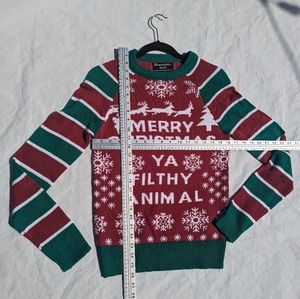 Festive Christmas sweater with playful text. Features red and green stripes. Snowflake and holiday graphics.