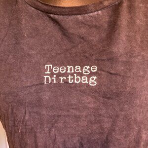 "Teenage Dirtbag" print on a black acid wash crop tshirt, lace hem, shirt appears grey