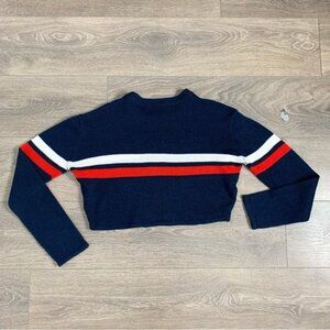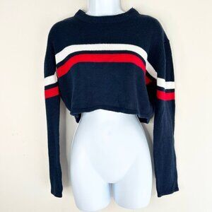 Bluenotes Women's Sweater Top Knit Cropped Stripe Long sleeve Navy Blue Medium