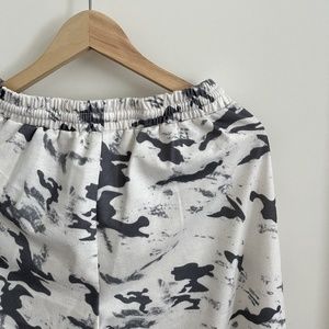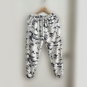 Blue/white camo print drawstring casual sweatpants/joggers with two front pockets.
