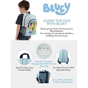 Kindergarten Bag With Two Mesh Side Pockets: With a zippered front compartment, front pocket and two dark blue mesh side pockets, this Bluey and Bingo backpack has ample room to store your little one’s daily essentials
