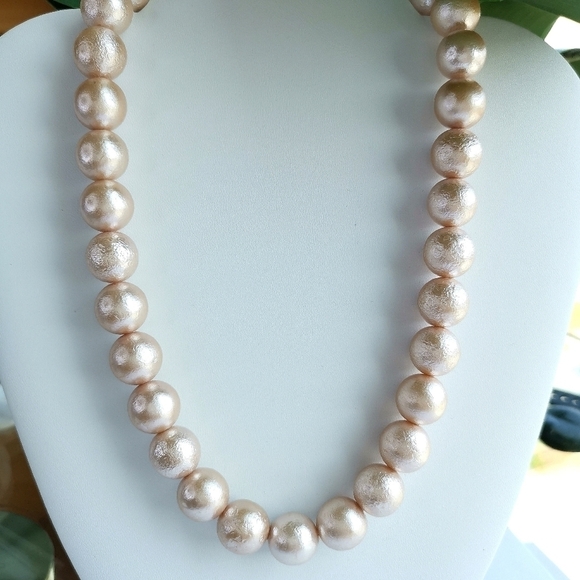 This pearl necklace epitomizes timelessness and elegance. The colour is a neutral pink with a lightly textured surface.
