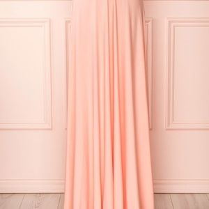 Evening gown in a beautiful blush colour and a silky, stretchable fabric. The semi-circular maxi skirt drapes elegantly, while the top - consisting of two wide strips of fabric - offers endless styling possibilities, so you can create a perfect look just for you. A wonderful option for bridesmaids! This dress can be styled in so many different ways!