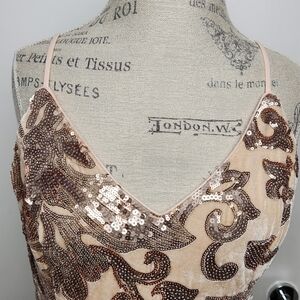 Creamy blush pink velvet velour fitted mermaid maxi gown with rose gold floral pattern sequins overlay, 'Love to You' from Lulu's.