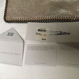 "Pale Gold" Falabella crossbody bag by Stella McCartney. (It looks pinkish-silver metallic to me.) Shiny dot texture. One main compartment with a zipper, short shoulder strap. Made from cruelty-free alternative to animal leather. Signature ruthenium recycled brass and aluminum diamond-cut chain. Waxed GOTS-certified organic cotton lacing. 25cm wide, 16 tall. New, never used, with all tags and dust bag. Retailed for $655.