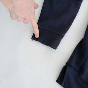 Model is 5'9, 170lbs, average shirt size medium, waist 32", inseam length 30". Clothing may show signs of being lightly worn, marks, piling, wrinkles, etc. as shown in photos. Just like to disclose its pre-owned / pre-loved. Note small mark on front, little wear on right elbow, fraying on cuffs shown in photos.