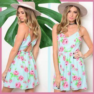 Summer garden party/wedding guest dress - Bo Bel aqua with pink roses, size medium. Adjustable spaghetti straps, fully lined, open back. Measurements laying flat are 17" armpit to armpit, 13" at the waist, 24" armpit to the bottom hem. 100% polyester.