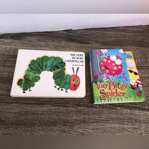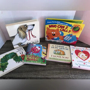 Titles include: Snuggle Puppy a love song by Sandra Boynton; Who can I call published by wishing well books; Guess how much I love you by Sam McBratney; Dogs by Emily Gravett; The Very Hungry Caterpillar by Eric Carle; and Itsy Bitsy Spider by Charles Reasoner.