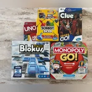 Collection of popular board games including Blokus, Uno, Sorry Dice, Monopoly Go, and Clue. Perfect for family game nights.