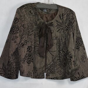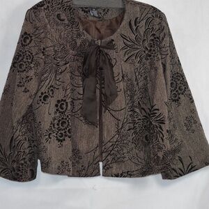 This jacket is so beautiful. Bob Mackie designs great jackets!. It is lined with an open front and a satin ribbon tie. It's a 3/4 sleeve length, ask for measurements. Lovely fabric, brown with a raised black velvet print. SZ 12