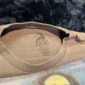 Celebrate reggae legend Bob Marley with this classic Zion Rootswear T-shirt! Features a vivid, sunset-hued portrait of Marley with palm tree accents. Made from soft, worn-in cotton for that perfect vintage look and feel. Size Large.