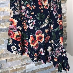 A vibrant print adds feminine style to a trendy high/low midi skirt with a flattering ruffled hem.