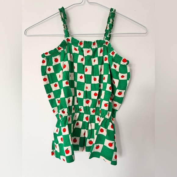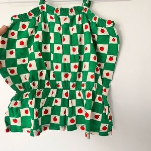 Charming romper with a green checkered pattern and red apple accents. Ideal for playful outings.