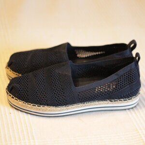 Shoes have been worn a few times over one summer and are in very good condition. They have a navy blue knit mesh upper, a jute trim around the midsole, a rubberized outsole and a squishy memory foam insole.