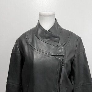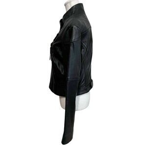 Elevate your style with this sleek black leather jacket. Perfect for any occasion, it offers a timeless look and comfortable fit. Perfect condition measurements and further description in the photos.