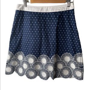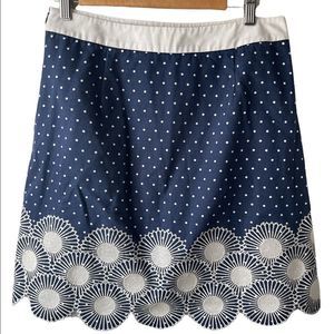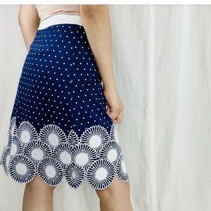 Stylish A-line skirt by Boden. Features a blue base with white polka dots. Intricate white floral hem design. Such a pretty skirt, sadly doesn’t fit me. 😣