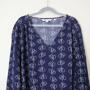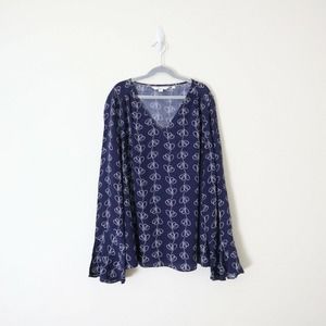Boden Victoria Blouse Bell Sleeve V Neck Top Navy Blue White Print #W0201