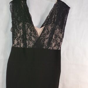 Little Black Dinner Dress Lace on top lined in nude. Bottom Stretches 14% Spandex 86% Rayon, XL Suzy Shier.