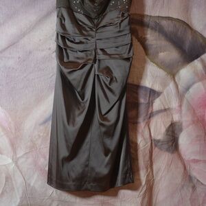 Squeeze into this dress and show off your amazing bod! It has a sparkly sequinned light fabric on the cowl neckline. Shimmering Brown, with a stretch to it. Satiny finish. Truly sexy! She 12 by Suzi Chin for Maggy Boutique