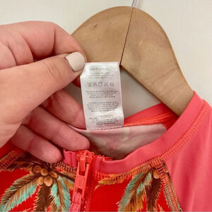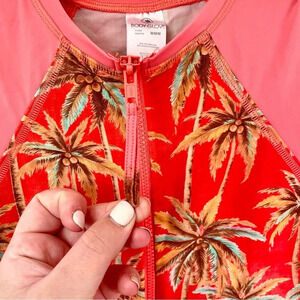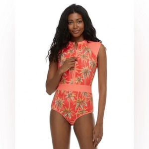 Body Glove Balata Garden UPF 50+ Stand Up Paddle Suit. Print is called sunset, gorgeous pink palm tree print. You'll be standing nice and tall in the Stand Up paddle suit. This crewneck cross-over piece features raglan cap sleeves and a zip front, as well as UPF 50+ material that shields you from the sun's rays. Stand Up's flat-lock seams and mid-coverage bottom will have you feeling comfy and confident all day long. Size Medium. Excellent condition other than a bit of discolouration on the zipper pull.