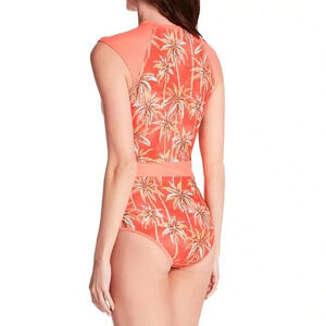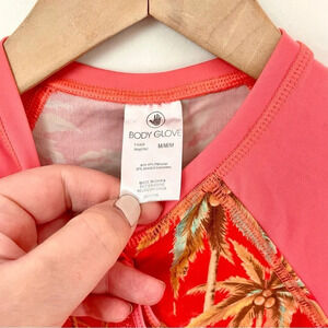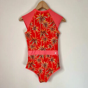 Body Glove Balata Garden UPF 50+ Stand Up Paddle Suit. Print is called sunset, gorgeous pink palm tree print. You'll be standing nice and tall in the Stand Up paddle suit. This crewneck cross-over piece features raglan cap sleeves and a zip front, as well as UPF 50+ material that shields you from the sun's rays. Stand Up's flat-lock seams and mid-coverage bottom will have you feeling comfy and confident all day long. Size Medium. Excellent condition other than a bit of discolouration on the zipper pull.