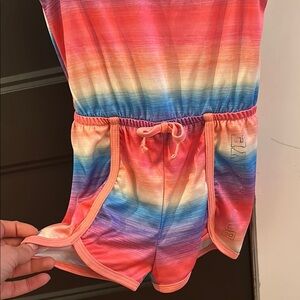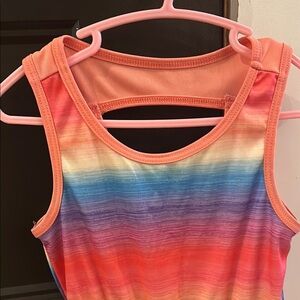This vibrant one piece features a stylish sleeveless design with a gathered waist for a comfortable fit. The bright pink and orange colors create a cheerful look perfect for any occasion.