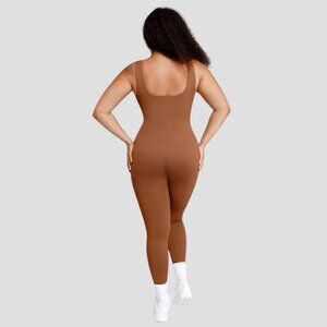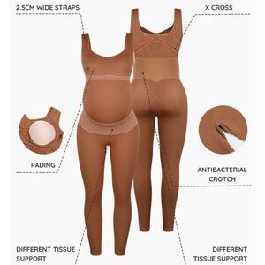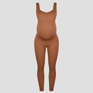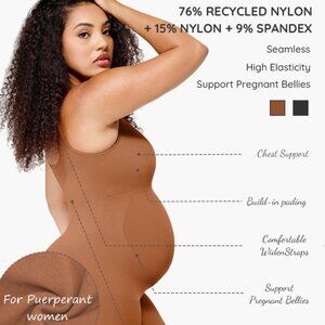 Designed for comfort and support during pregnancy, this seamless maternity shapewear jumpsuit features a non-compressive core that allows for a growing baby bump and full back support and removable bra padding. It is also designed with an open gusset for added convenience under clothing. This all in one bodysuit will also lift, sculpt and shape your natural silhouette during pregnancy. 76% recycled nylon, 15% nylon, 9% spandex. Machine washable.