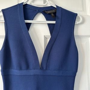 Beautiful blue body-con bcbg dress with back cut out, low cut in chest area.