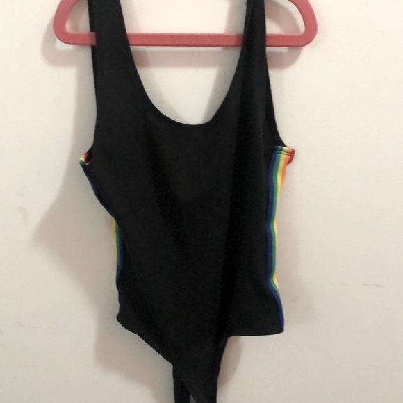 Black bodysuit with rainbow stripes down the side. Never worn.