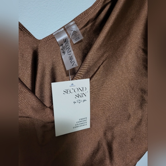 nwt, only tried on but not for me. gorgeous copper color, deep v neck and nice compression, thick fabric.