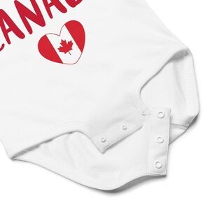 Rabbit Skins bodysuit in white features a 'Made with LOVE in CANADA' customized design, complete with a maple leaf emblem.
