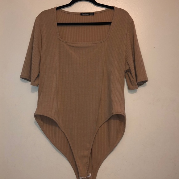 Tan brown fashion bodysuit. Very comfortable and light weight. This bodysuit is detailed with strips that run downwards. The arms are slightly above elbow length. It is closed at the bottom with a two clip that pins the front to the back.